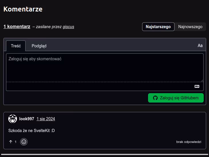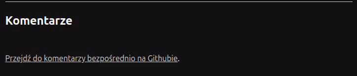 Na swojej stronie używam systemu Giscus. Pozwala on dodawać komentarze w formie dyskusji na GitHubie. Każdy wpis ma swoją własną dyskusję. Tak dodane komentarze są wyświetlone na dole, pod każdym wpisem:
